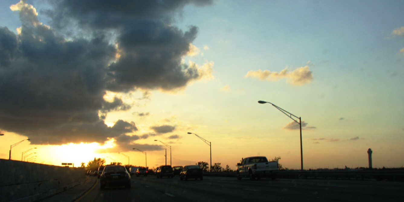State Road 836, locally known as the Dolphin Expressway (to commemorate two consecutive national championships of the Miami Dolphins football team,) is a 16-mile-long six-lane divided tollway. Curiously, toll is collected only in the East bound direction. This is West bound, at the end of a workday. The traffic jam is always bad at the Miami International airport to the right where you see the control tower. Of course, all takeoffs and landings are in the West-East runways at this time so pilots do not have the sun in their eyes. That makes sense.